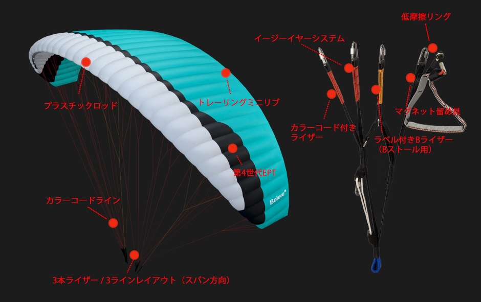 BOLERO8は1stグライダーとして有効ですが、レジャーパイロットやハイク&フライなど、インターミディエートクラスとしてのパフォーマンスを有しています。