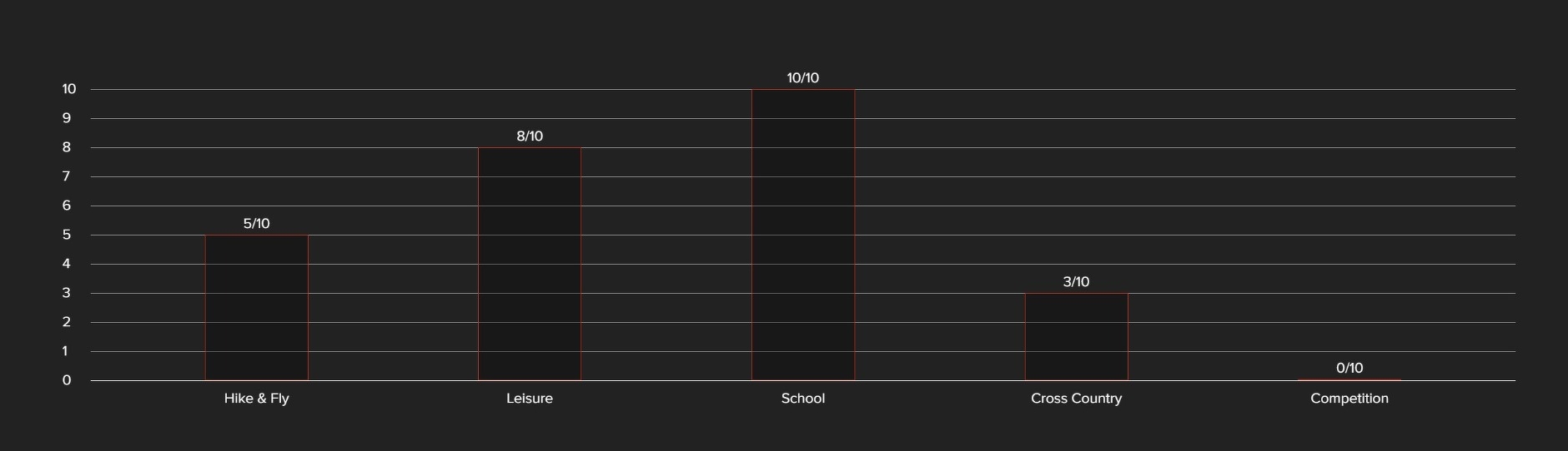 スクールグライダーとして開発されましたが、ボレロ8は驚くべき空力効率を発揮します。ボレロ8は長いブレークレンジを備え、失速点が近づくと明確に知らせてくれるため、初めてのフライトに最適です。同時に、滑空性能と上昇性能も備えており、長距離フライトやホームエリア以外の初フライトツアーにも対応します。